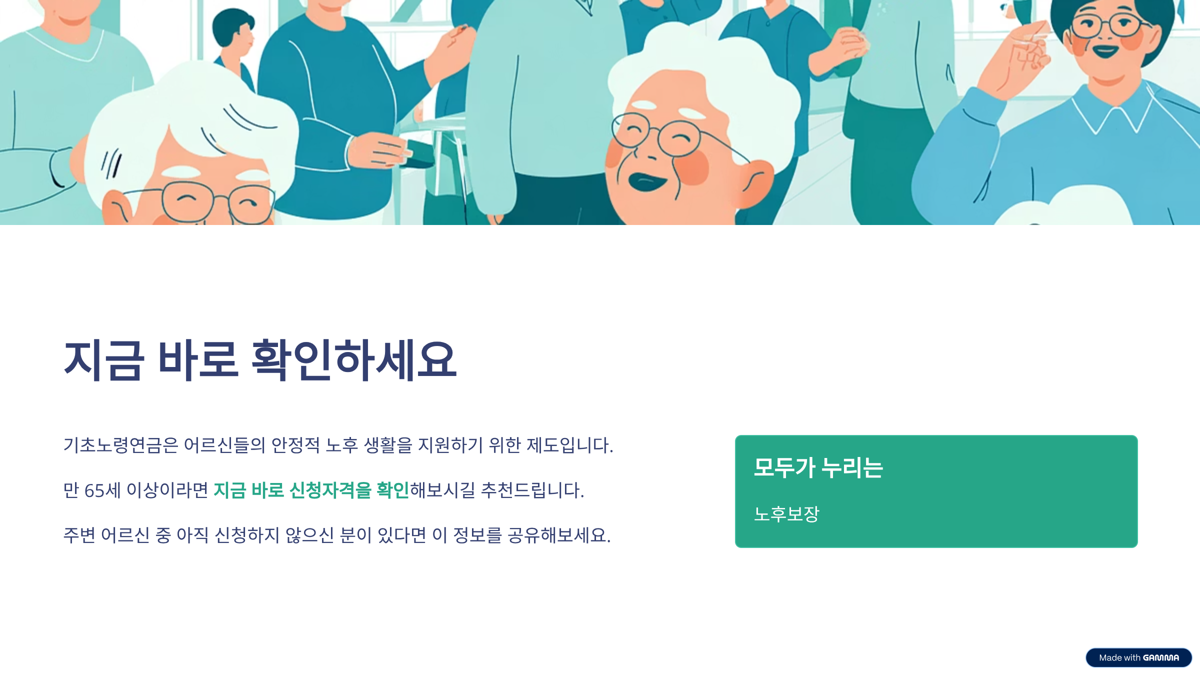 주변 어르신 중 아직 신청하지 않으신 분이 있다면 이 글을 공유해보세요. 모두가 누릴 수 있는 노후보장이 되길 바랍니다.