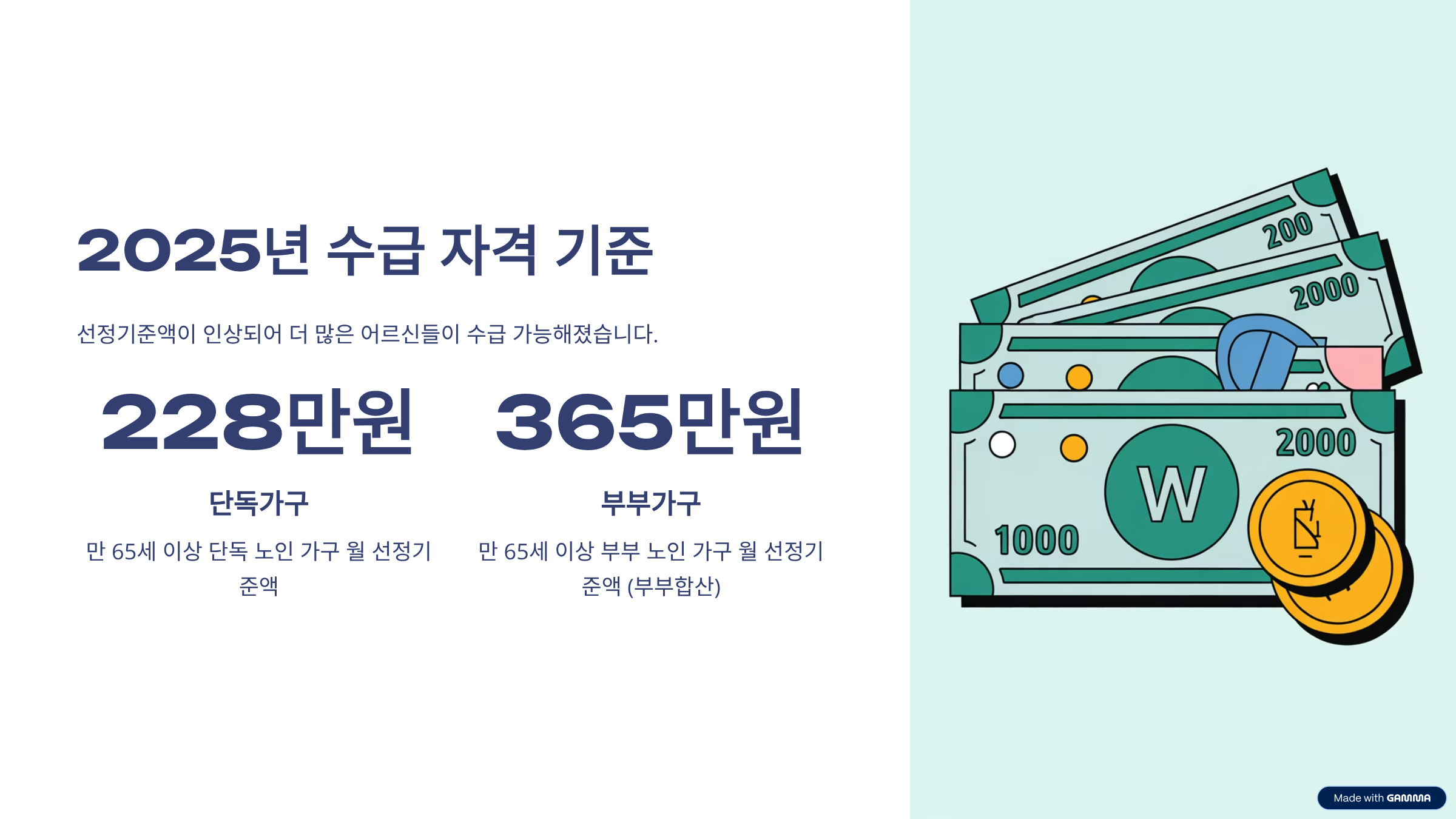2025년에는 선정기준액이 인상되어 더 많은 어르신들이 수급 가능성이 높아졌습니다.