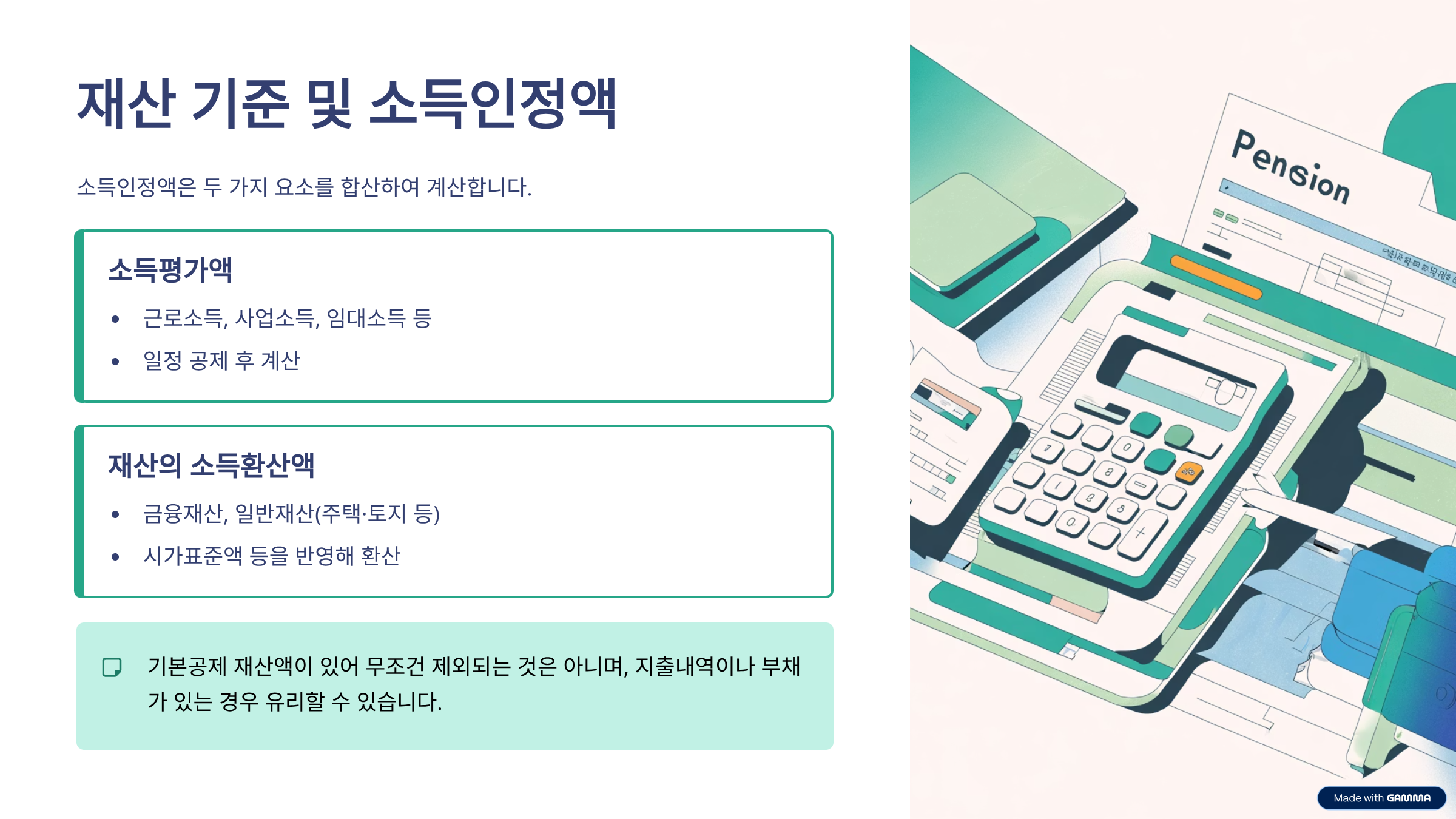 예컨대, 금융 + 일반 재산이 많아 보여도 ‘기본공제 재산액’ 등이 있어 **무조건 제외되는 건 아니므로** 지출내역이나 부채 등이 있는 경우 유리해질 수 있어요.