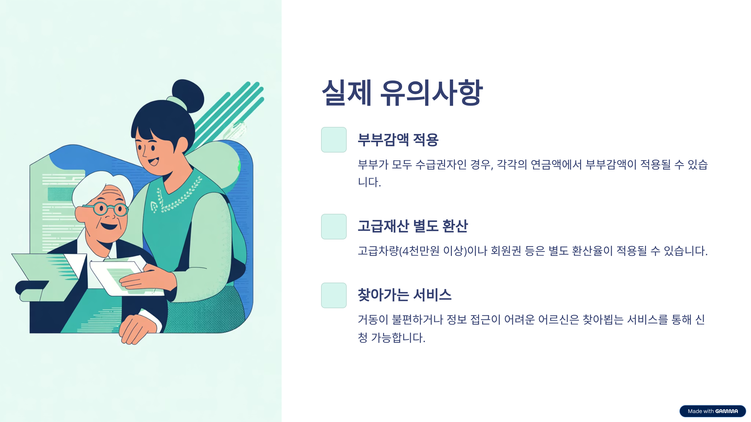 - 부부가 모두 수급권자인 경우, 각각의 연금액에서 “부부감액”이 적용될 수 있어요.