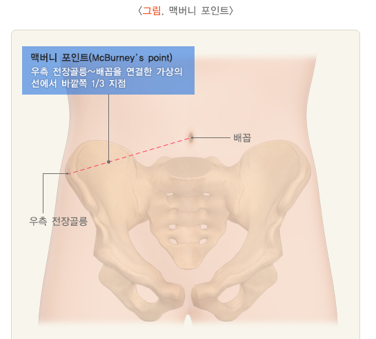 - 배꼽 주위 통증 → 시간이 지나며 오른쪽 아래 복부 통증으로 이동