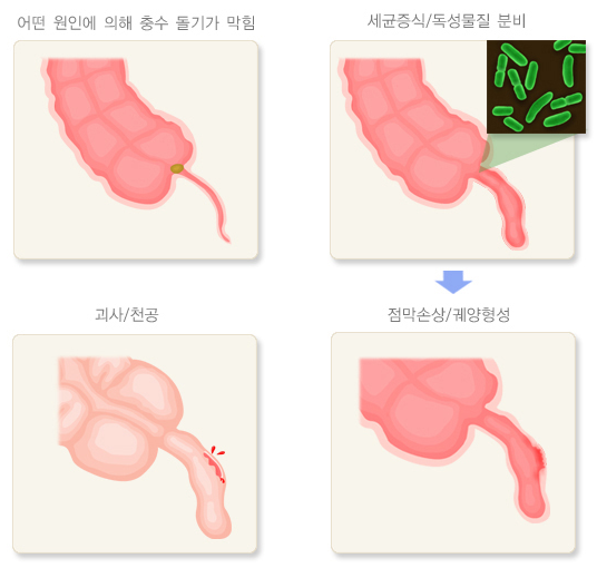 - 충수 안이 대변 찌꺼기나 림프조직 등으로 막힐 때