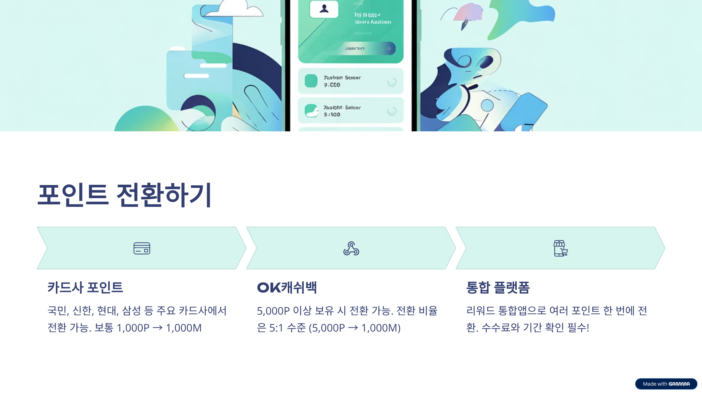 - 전환비율: 보통 1,000P → 1,000M (카드사별 상이)