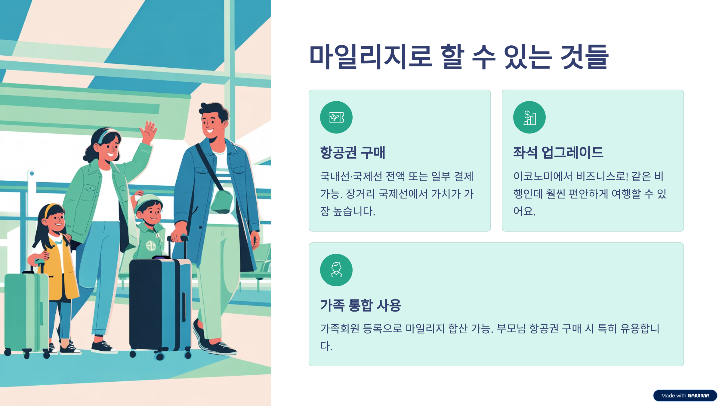 - 마일리지 부족 시: 가족 마일리지 합산하거나 일부 현금 병행 결제 가능