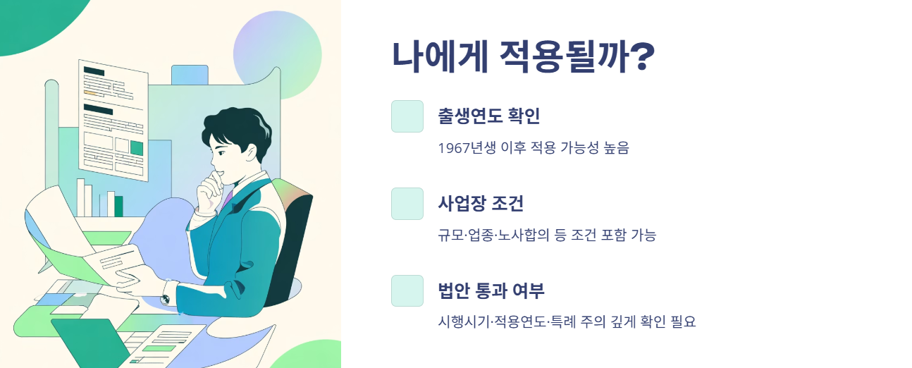 - 현재 나의 **출생연도**로부터 정년 연장 적용 가능성을 살펴보세요 (예: 1967년생 이후라면 적용 가능성이 높다는 전망).