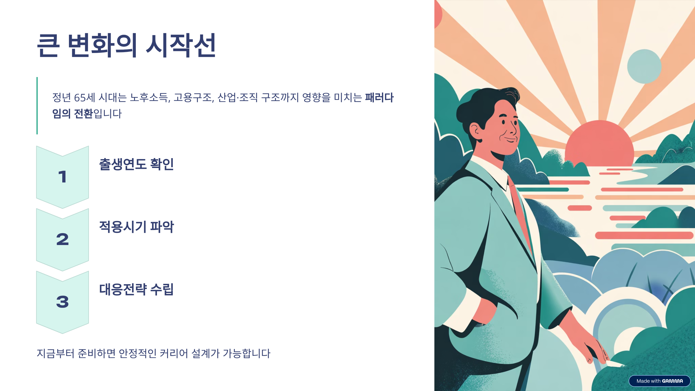 정년 65세 시대는 단순한 숫자의 변화가 아니라 노후소득, 고용구조, 산업·조직 구조까지 영향을 미치는 **큰 변화의 시작선**이라는 의미가 있어요.